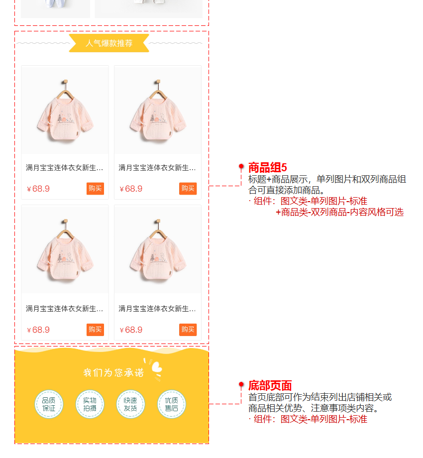 使用组件:固定搜索框、图片轮播、单列图片、单列图片热区、按钮组、商品其他类型、双列商品